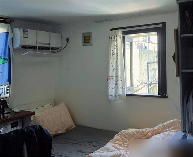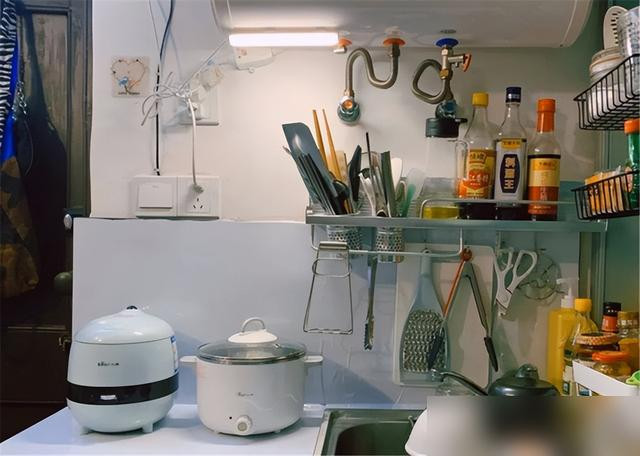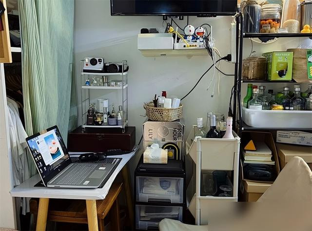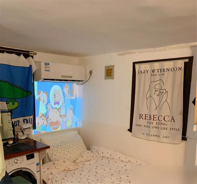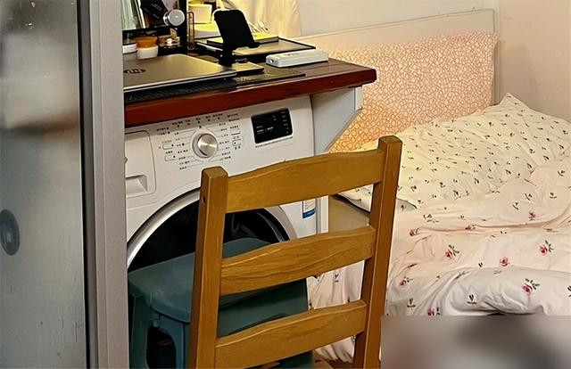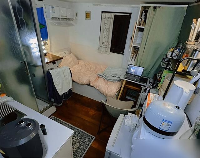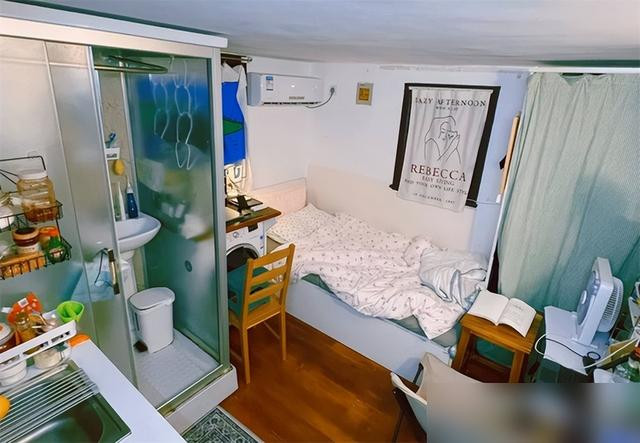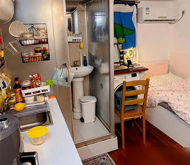她那小空间里,厨房就巴掌大,用电磁炉煮点简单饭菜;卫生间挤成独立小隔间,好歹不用排队;卧室塞张单人床,床头还架投影仪看个电影。